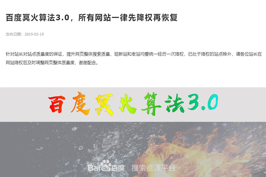 不过前几天(2019年3月14日星期四)百度搜索资源官方发布烽火算法升级,持续打击网络劫持问题的事是真,这一点希望各位站长重视。文章中并未提及图中所说的所有网站都将一律先降权再恢复排名的说法,所以这是这个假消息请大家不要相信!